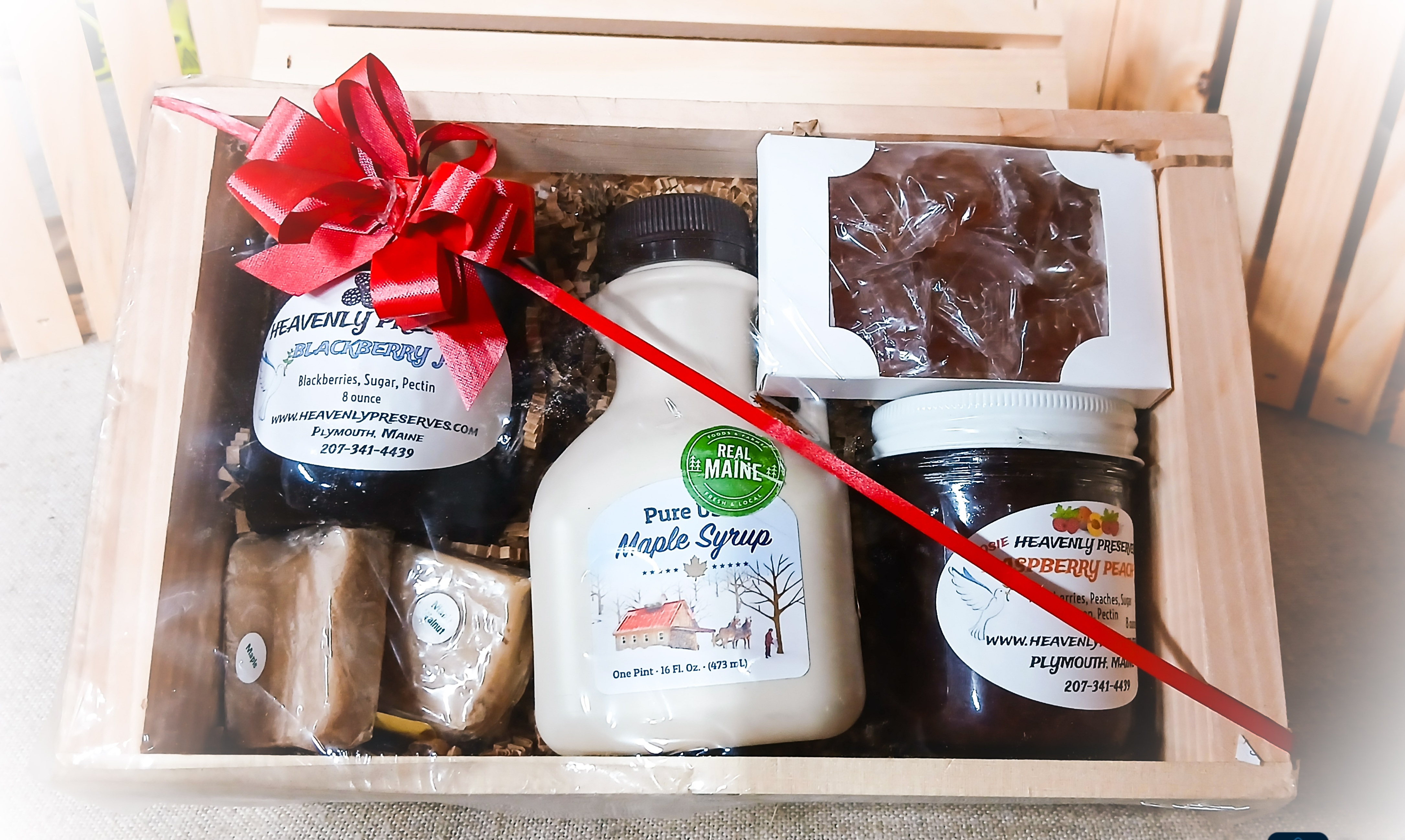 Contains: A Pint of Bob’s Pure Maine Maple Syrup (container may vary), 2 – assorted 8 oz  Heavenly Preserves, 2 pcs individually wrapped maple fudge (maple and/or maple walnut), and a 10 count box of maple hard candy. Comes packaged in attractive wooden box.