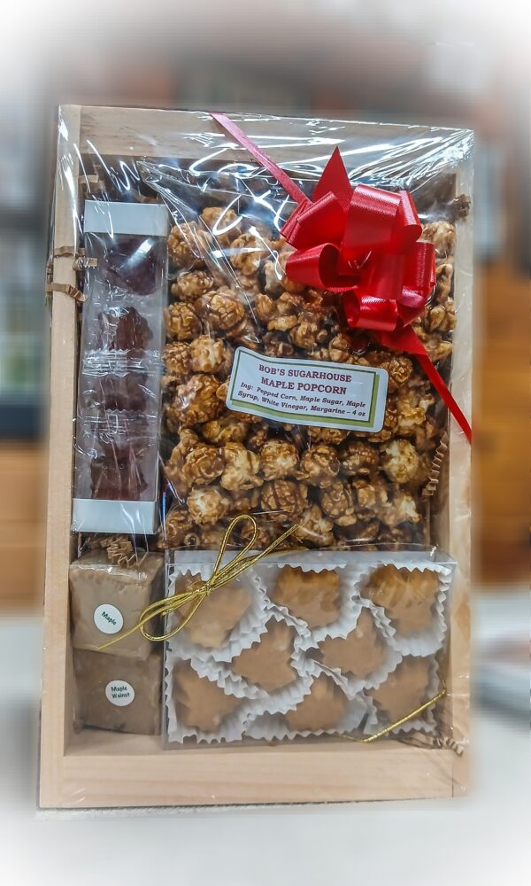 4 oz Maple Popcorn, 8 ct Maple Sugar Candy, a 5 ct box of Maple Hard Candy, and 2 individual Maple Fudge (maple and/or maple walnut) arranged in a re-useable wooden pine crate.