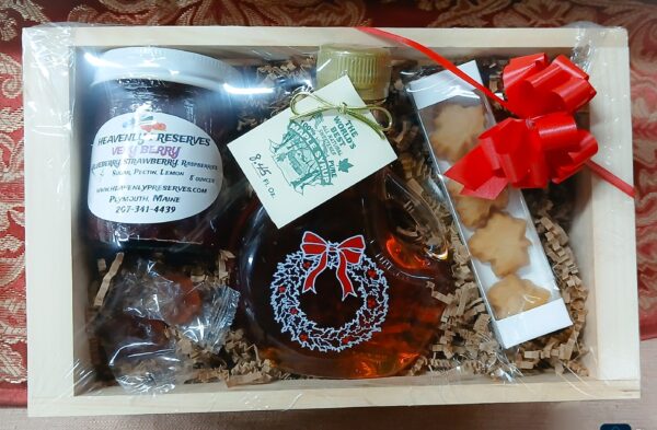 An adorable wooden crate filled with an 8.45 oz Painted Wreath glass bottle, a 4 count Maple Sugar Candy, an 8 oz jar of Heavenly Preserves (assorted), and 2 individually wrapped Maple Hard Candies.